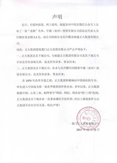 近日,有媒体报道、网上流传,福建泉州中院在微信公众号上公布了一份“老赖”名单,中通(泉州)投资有限公司的法定代表人吴丹樱涉案金额5.5亿,该公司的股东为吴丹樱及福建华体会体育有限公司。对此厦门正大农牧有限公司发布声明,内容如下: